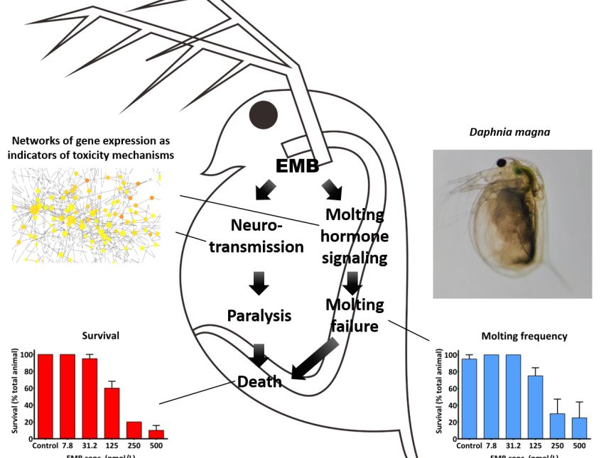 - By combining standardized acute toxicity testing with advanced molecular- and cellular techniques, EMB was demonstrated to both affect neurotransmission in D. magna, but also interfere with normal molting due to disrupting endocrine signaling, Song says.