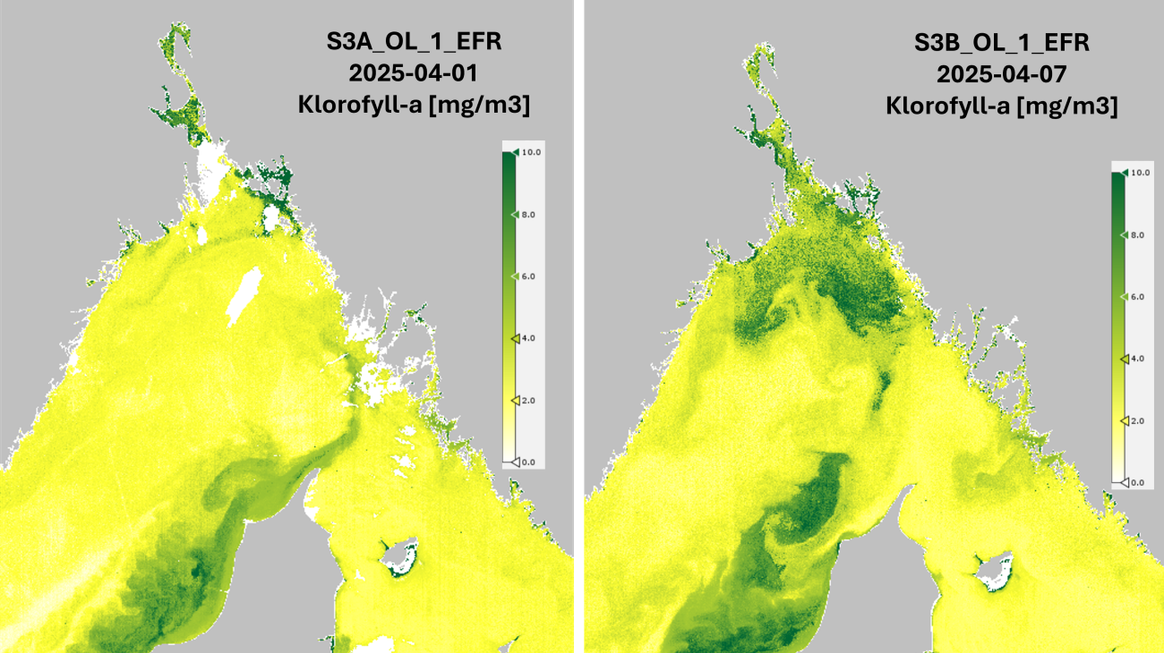 Den skadelige Pseudochattonella-algen, som i forrige uke tok livet av fisk i Danmark, kan følges som grønn «sky» på satellittbilder. Det er lett å se hvordan algene forflytter seg over tid.